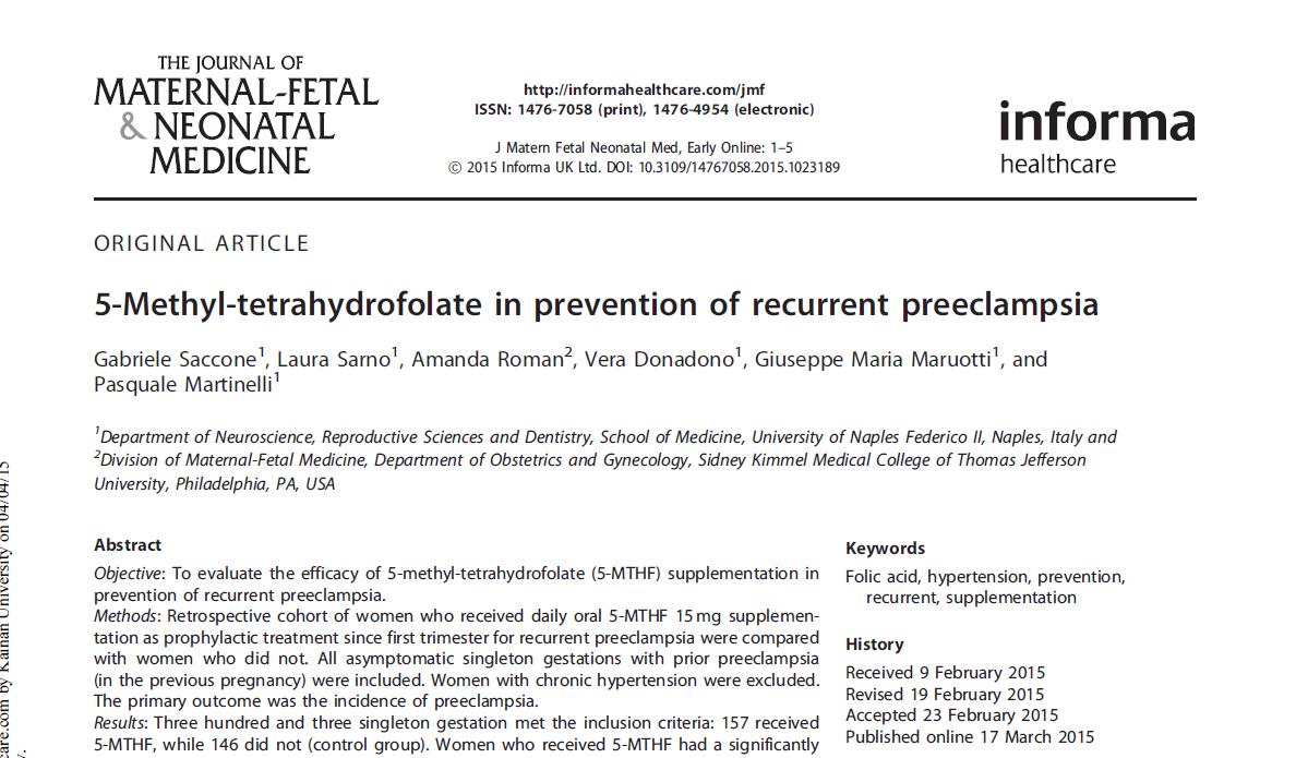 2015 italialainen retrospektiivinen kohorttitutkimus (n = 303 naista, joilla oli aikaisempi preeklampsia) osoitti sen 15 mg 5-MTHF:a päivittäin ensimmäisestä raskauskolmanneksesta lähtien vähensi yleistä uusiutumista preeklampsia 39,7 %:sta 21,7 %:iin (OR 0,57, 95 % CI 0,25–0,69), vaikea preeklampsia 8,9 %:sta 3,2 %:iin (OR 0,44, 95 % CI 0,12–0,97) ja varhain alkava preeklampsia 7,5 %:sta 1,9 %:iin (OR 0,34, 95 % CI 0,07–0,87) [2].
