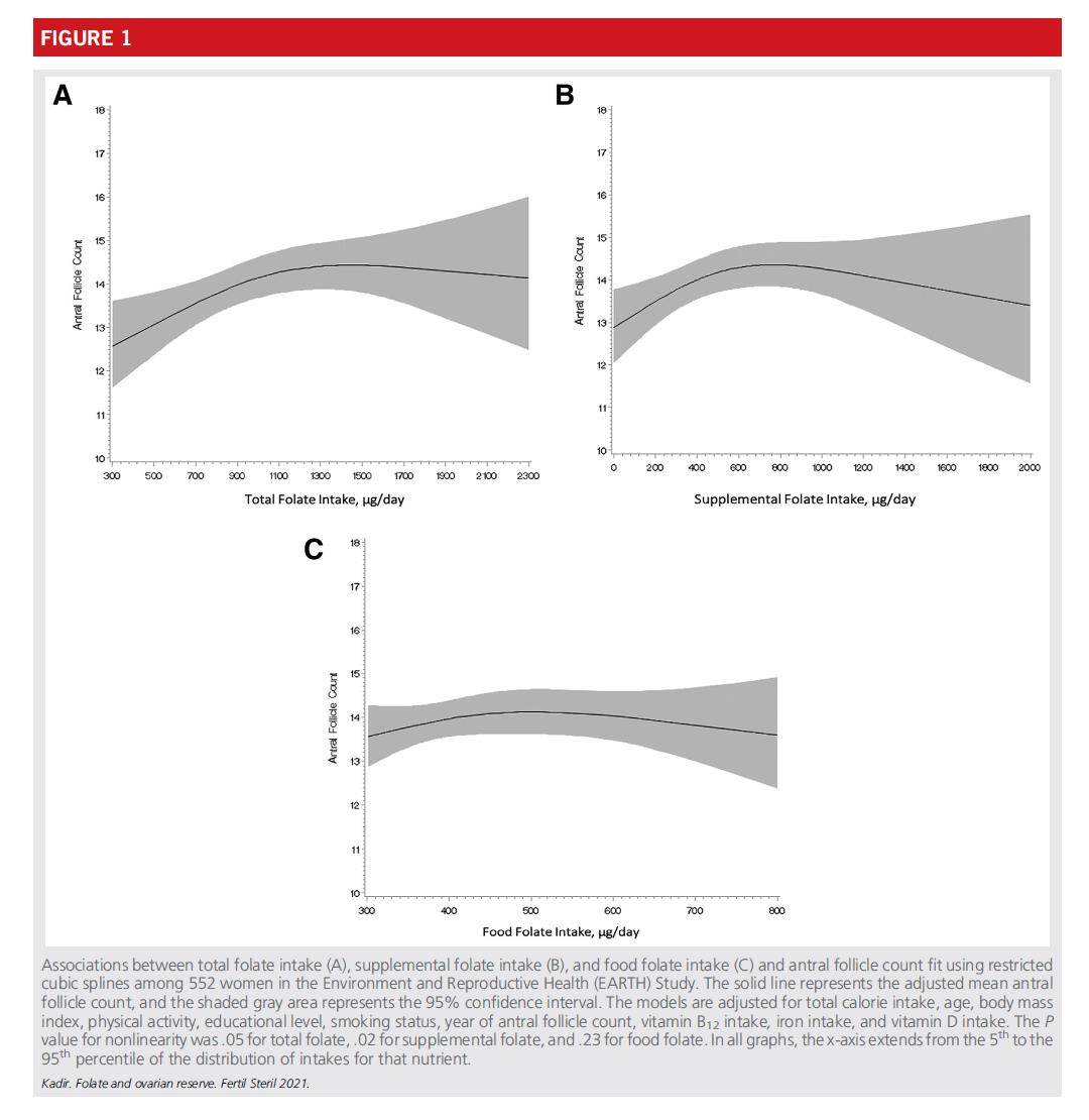 Tiedot osoittivat, että positiivinen korrelaatio foolihapon kokonaissaannin ja AFC saavuttaa tasanteen noin1200 mikrogrammaa päivässä. Huippuhyöty foolihapon saannissa ravintolisistä (foolihappo, synteettinen foolihappo) esiintyy noin klo800 mikrogrammaa päivässä. Verrattuna naisiin, joilla on päivittäin 400 mikrogrammaa foolihappoa, jotka kuluttavat 800 mikrogrammaa päivässä odotetaan kasvavan noin1,5 follikkelia.
