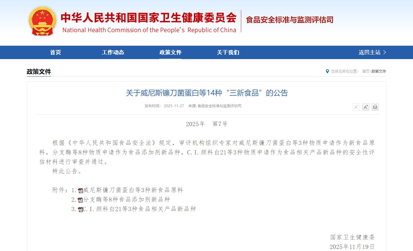 [1] Kiinan kansantasavallan kansallinen terveyskomissio.Ilmoitus 14. päivänä "Kolme uutta ruokaa", mukaan lukien Venetian Fusarium Protein (2025, nro 7).