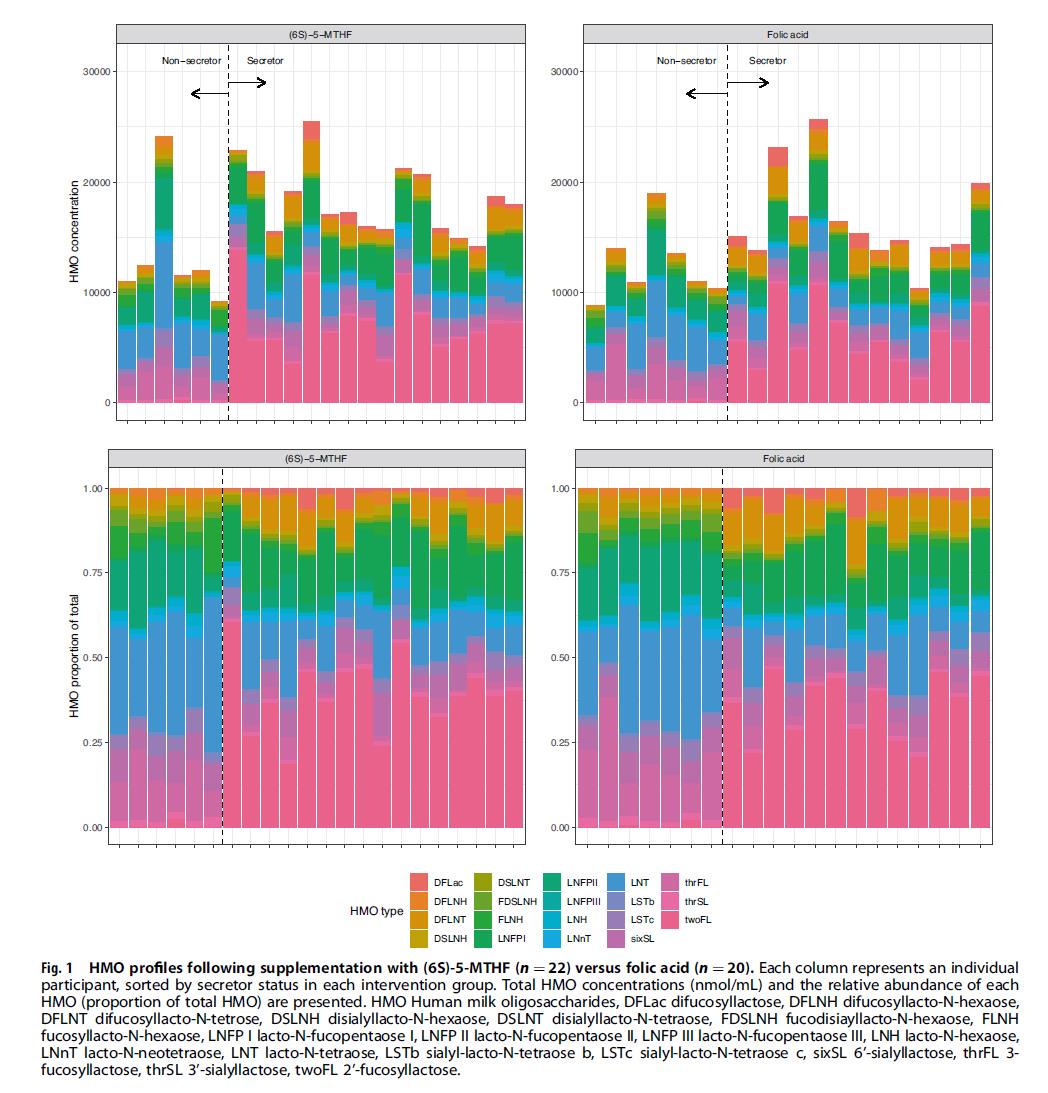 Tästä tutkimuksesta tuli odottamaton havainto: vaikka HMO:n kokonaistasot eivät eronneet merkittävästi näiden kahden ryhmän välillä, metaboloimattoman foolihapon (UMFA) osuus äidinmaidossa foolihapporyhmä saavutti jopa 29 %, yli kymmenen kertaa enemmän kuin 5-MTHF ryhmä. Erityisesti tietoanalyysi paljasti, että korkeammat UMFA-tasot olivat liittyy alhaisempiin HMO-kokonaispitoisuuksiin ja vähentynyt merkittävästi 3′SL.