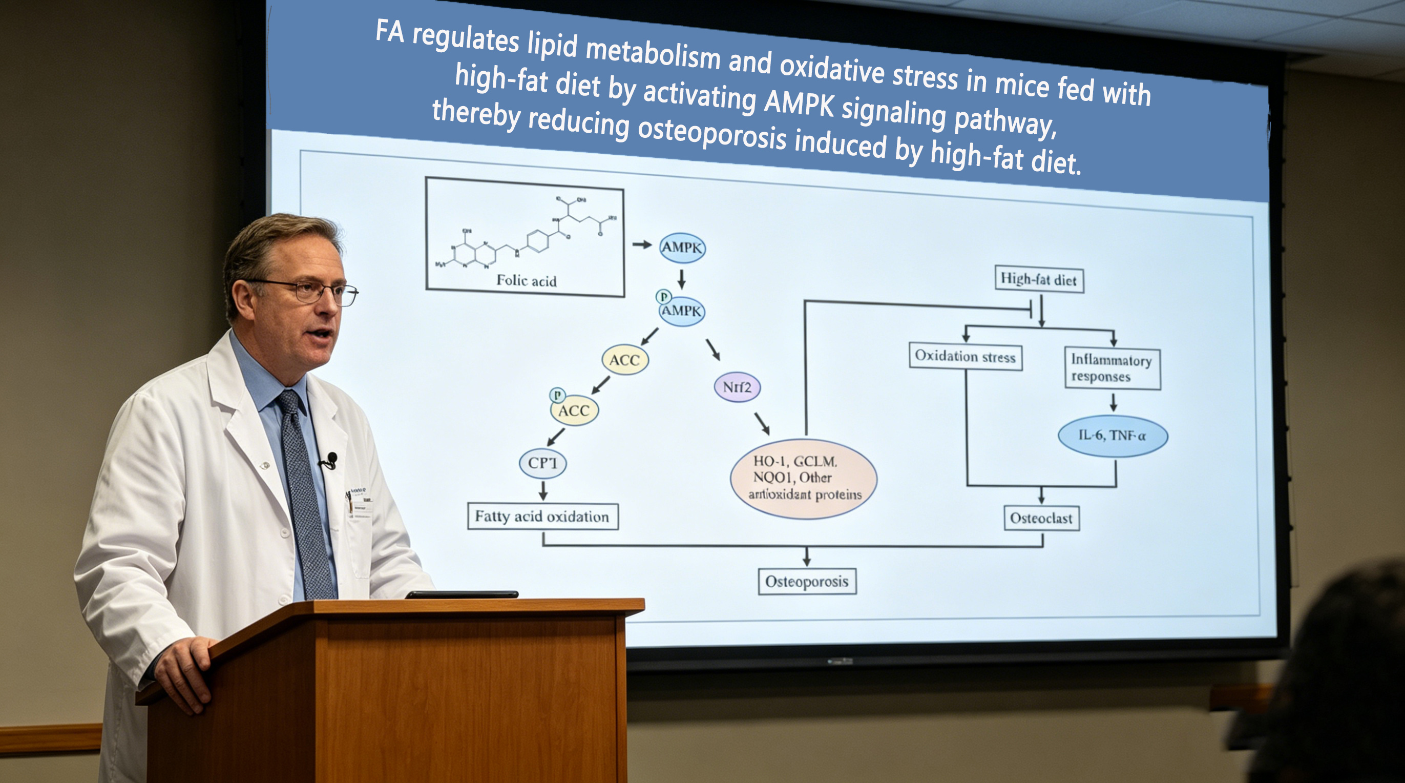 Vuonna 2022 *Frontiers in Cell and Developmental Biology* julkaisi tutkimuksen, jonka otsikko on *Foolihappo heikentää rasvaisen ruokavalion aiheuttamaa osteoporoosia AMPK-signaalireitin kautta*. Yksinkertaisesti sanottuna runsasrasvainen ruokavalio heikentää luita, ja foolihappo voi lievittää tätä prosessia AMPK-reitin kautta.